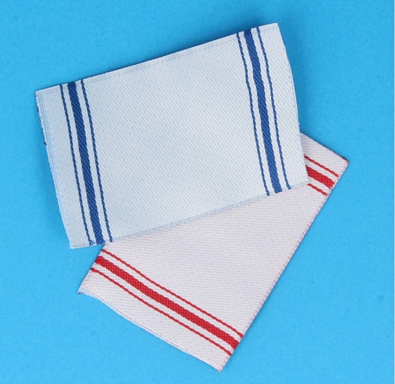 Due asciugamani da cucina, uno a righe rosse e uno a righe blu.