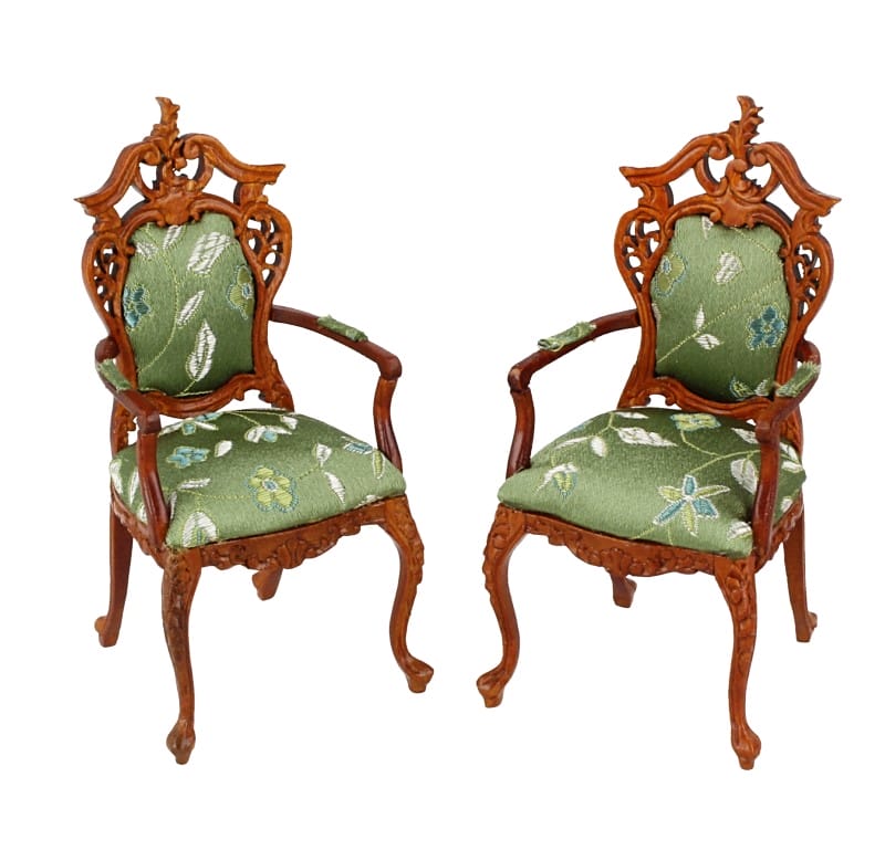 Set di due sedie con struttura intagliata in legno e rivestimento verde con motivi floreali. Disponibile solo un set di 2 sedie.